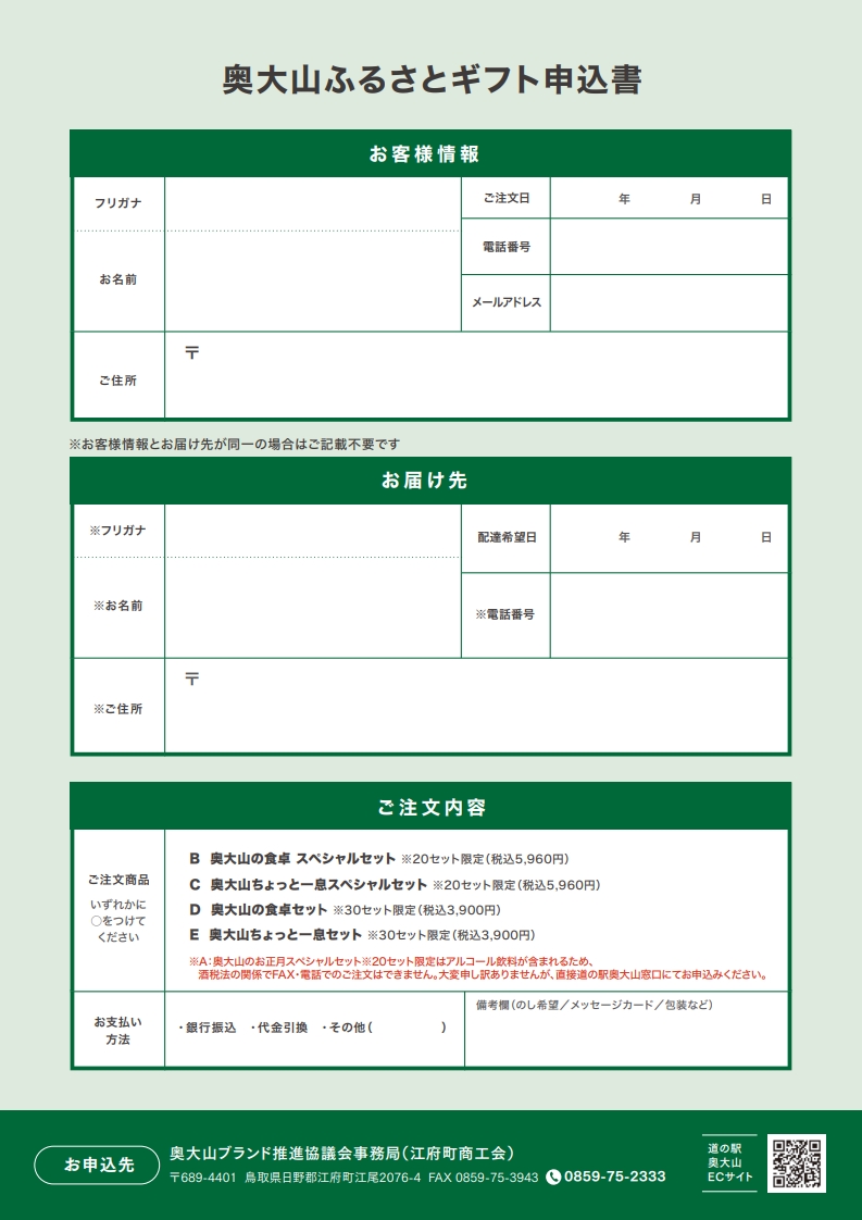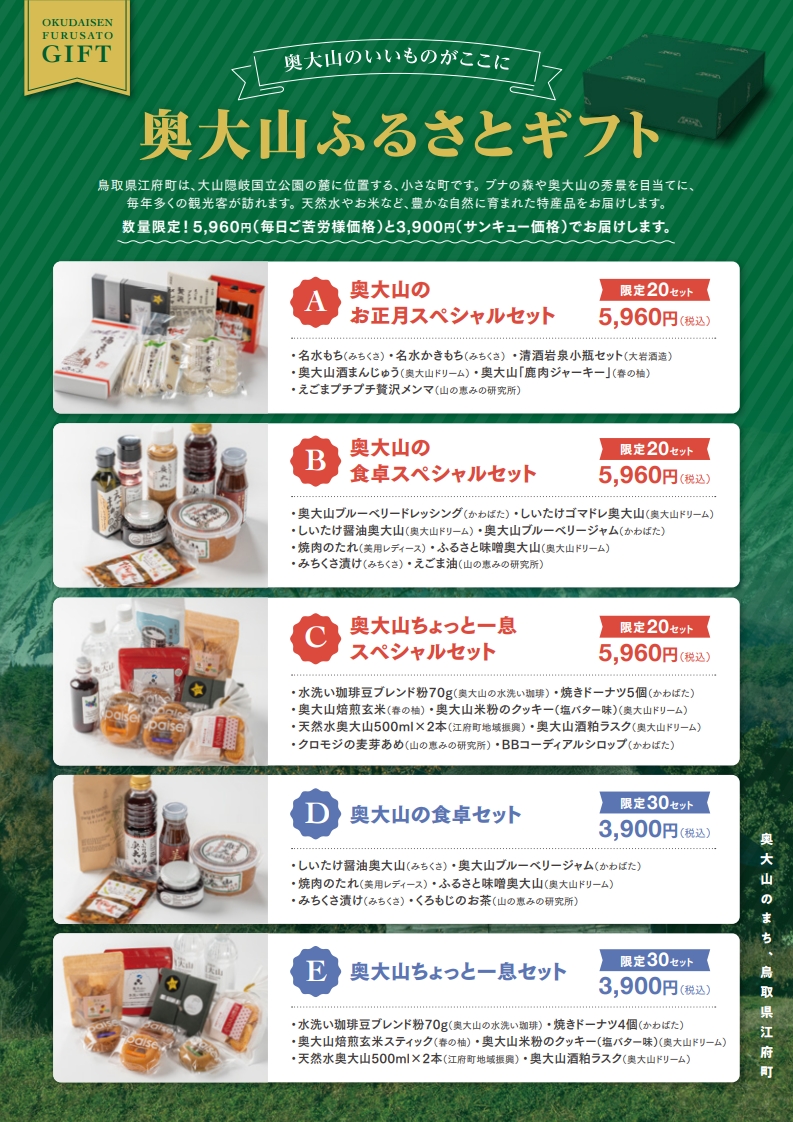 今般、本協議会初の取り組みとしてブランド認定商品のみを対象に、江府町の魅力をギュッと詰め込んだ歳末限定の「ふるさとギフト」を製作し、「道の駅奥大山」を窓口に11月10日(月)より販売受付開始致します。
